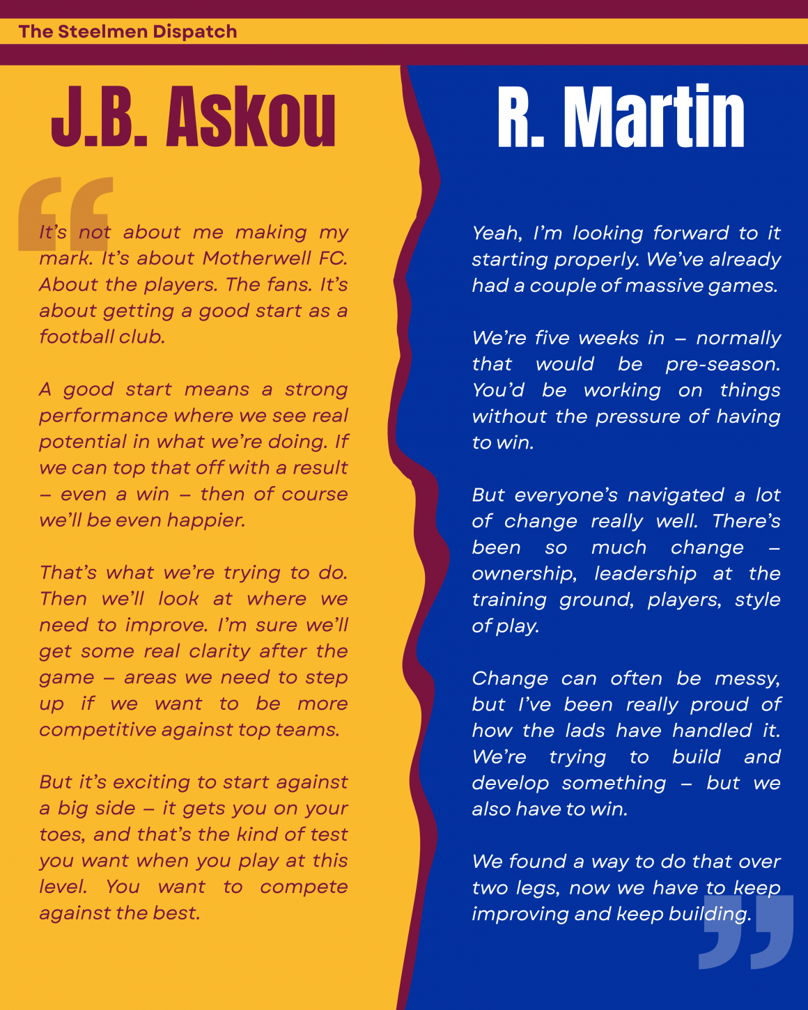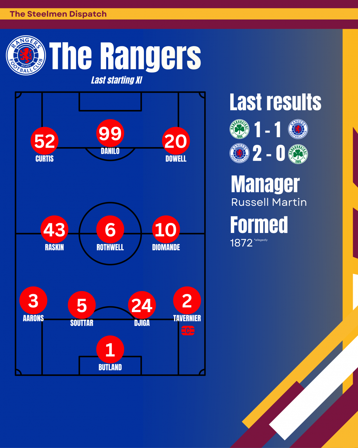 Expect Rangers to want more than just a result. They’ll want a performance — something sharp enough to show fans that the rebuild is working. Expect them to control large parts of the game and try to break quickly when space opens. They’ll be ready for a low block, and they’ll have drilled the rotations to try and pull Motherwell out of shape. Expect bookings, too. On Sky Sports, Martin said one thing he regrets about his past teams is that they were too innocent, too naive. He knows that this won’t fly in Scotland, and I fully expect Rangers to try and get in our faces today.